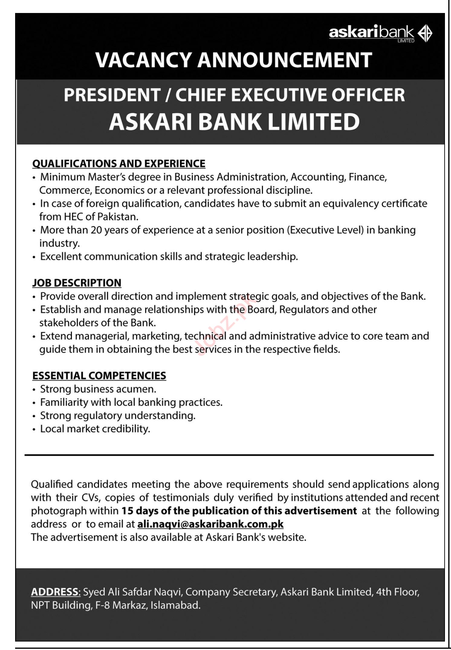 Askari Bank Islamabad, islamabad Islamabad Pakistan invites applications from eligible candidates for the post of president and chief executive officer as per advertisement of June 9, 2024 published in daily Express Tribune Newspaper. Educational qualifications required Master and Mphil etc.