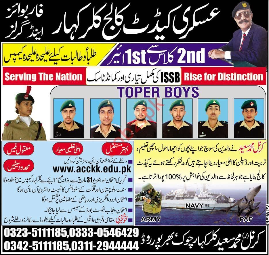 Askari Cadet College Kallar Kahar District Chakwal, Pakistan are announced admissions spring 2019 for academic session 2019 to 2020 for the classes of Class 2nd to Class 1st Year. Read newspaper ad for exact details.
