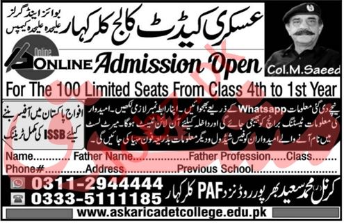 Askari Cadet College Mohalla Mohra, Kallar Kahar, Chakwal, Punjab, Pakistan Hot Line: