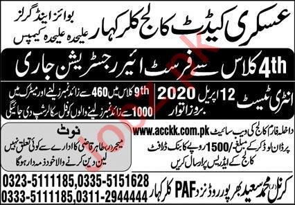 Askari Cadet College Kallar Kahar has announced admissions in 4th Class, 5th Class, 6th Class, 7th Class, 8th Class, 9th Class, Matric & 1st Year 2020. Read newspaper ad for exact details.