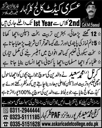Askari Cadet College Kallar Kahar invited applications for admissions in Class 2nd, Class 3rd, Class 4th, Class 5th, Class 6th, Class 7th, Class 8th, Class 9th, Matric and Intermediate. Read newspaper ad for exact details.