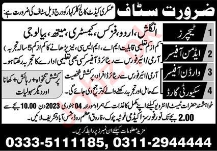 Askari Cadet College Chakwal, chakwal Punjab Pakistan invites applications from eligible candidates for the post of urdu teacher, teacher, english teacher, warden officer, chemistry teacher, physics teacher, math teacher, biology teacher, security officer and admin officer as per advertisement of January 1, 2023 published in daily Express Newspaper. Candidates with Intermediate, Bachelor, Master and Matric etc. educational background will be preferred.