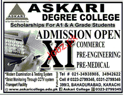 Askari Degree College Admission in Class XI in Karachi. Read newspaper ad for exact details.