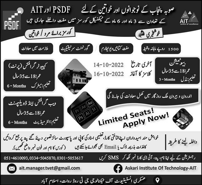 Askari Institute of Technology Short Technical Diploma Courses of Beautician, Computer Graphics Print, Web Graphics & Development, admissions 2022 has been started. Eligible students who qualify as per admission criteria in Askari Institute of Technology Islamabad Islamabad Pakistan can apply in Technical Course for academic year 2022. Students who want to enroll for academic session 2022 in Diploma and Course qualification and admission criteria for Government institute can apply till last date 15 October 2022. Read newspaper ad for exact details.