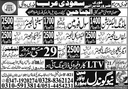 New Gondal Manpower Bureau is looking for candidates for following posts as per job advertisement published in daily Express Newspaper of May 27, 2025 for location Dammam, riyadh Saudi Arabia: