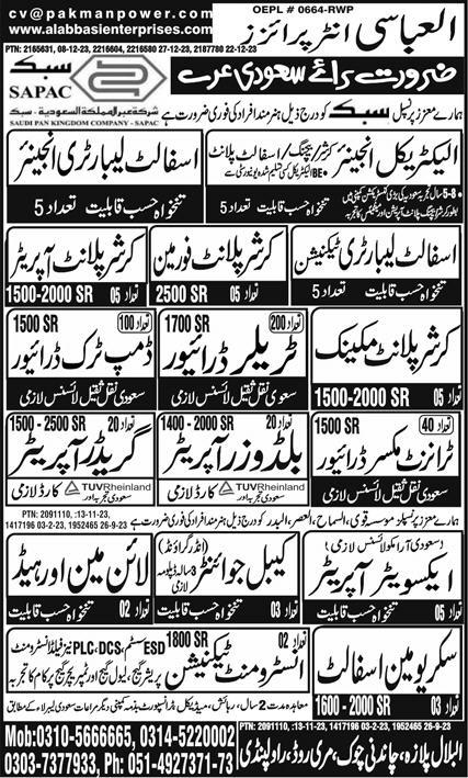 Vacant posts including lineman overhead, bulldozer operator, cable jointer, grader operator, instrument technician, trailer driver, htv driver, crusher plant mechanic, crusher plant operator, dump truck driver, excavator operator, screw man asphalt, transit mixer driver, driver, asphalt laboratory technician and crusher plant foreman are announced in Al Abbasi Enterprises Riyadh, dammam Saudi Arabia as per 10 January 2024 advertisement in daily Express Newspaper. Candidates with Matric, Bachelor, DAE, Intermediate and B.E etc. educational background will be preferred.