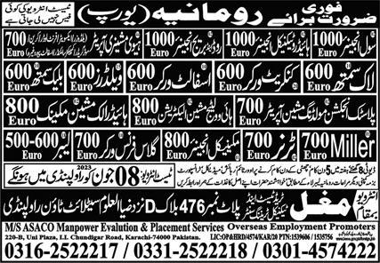 Mughal Trade Test & Technical Training Center jobs advertisement dated about 6 June 2023 in daily Express Newspaper invites application for the vacant post of labor, lock smith, concrete worker, miller, engineer, hydrotechnical engineer, turner, glass furnace worker, asphalt worker, welder, plastic injection molding machine operator, blacksmith, heavy machinery operator, road engineer, high voltage machine electrician, bridge engineer, civil engineer, hydraulic machine mechanic and mechanical engineer in Romania, romania Romania. Educational qualifications required DAE, Bachelor, Matric, B.E and Intermediate etc.