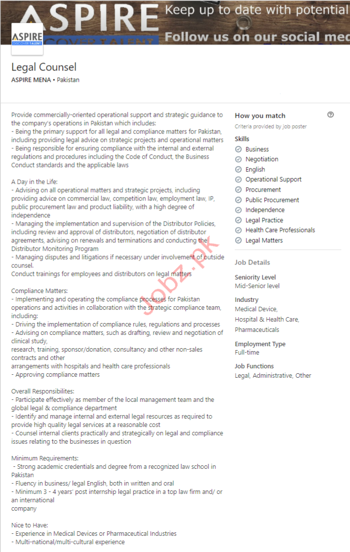 We have grown organically, making our name delivering “hard to find candidates” for our clients in Technology & Life Science. Our industry specialism is reflected in an enviable and growing client roster and unique talent pools. Aspire Mena is looking for qualified, energetic, motivated and experienced person for the vacant post of Legal Counsel.