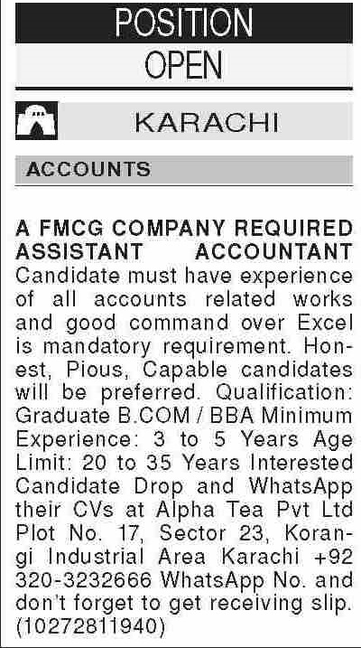 Vacant posts including assistant accountant are announced in FMCG Company Karachi, karachi Sindh Pakistan as per 13 January 2025 advertisement in daily Dawn Newspaper. Preferred Education is BBA and B.com etc.