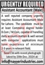 Private Company jobs advertisement dated about 15 December 2024 in daily Jang Newspaper invites application for the vacant post of assistant accountant in Lahore, lahore Punjab Pakistan. Candidates with Bachelor and Master etc. educational background will be preferred.
