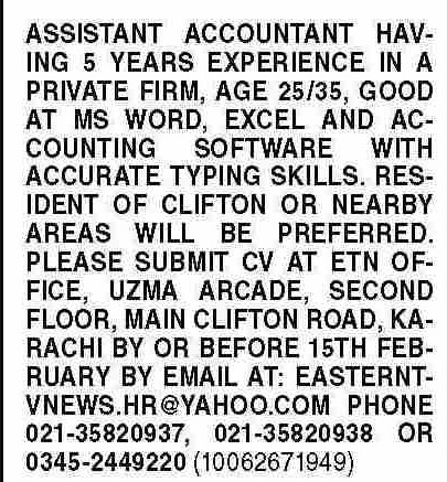 Private Company invites applications for job positions advertised in daily Dawn dated 6 February 2022 for following vacancies in Karachi Sindh Pakistan.