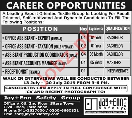 A Well-Known Private Textile Company in Faisalabad is looking for qualified, expert and Well-Mannered staff for their Organization for the Job of Office Assistant Export, Office Assistant Taxation, Assistant Production Coordinator, Assistant Accounts Manager and Receptionist.