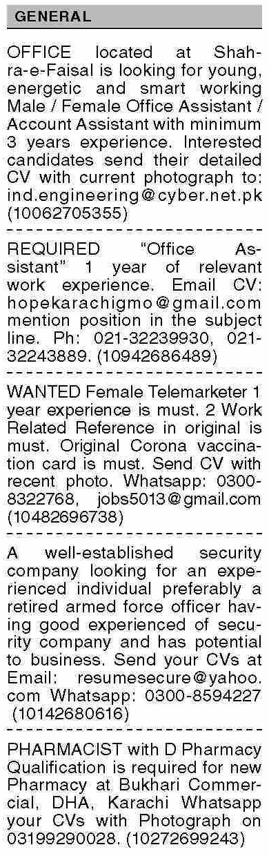 Private Company is looking for candidates for following posts as per job advertisement published in daily Dawn Newspaper of May 8, 2022 for location Karachi, karachi Sindh Pakistan: