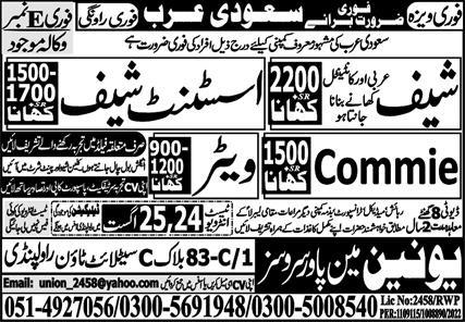 Vacant posts including commie, waiter, assistant chef and chef m are announced in Union Manpower Services Riyadh, dammam Saudi Arabia as per 23 August 2022 advertisement in daily Express Newspaper. Candidates with Matric and Intermediate etc. educational background will be preferred.