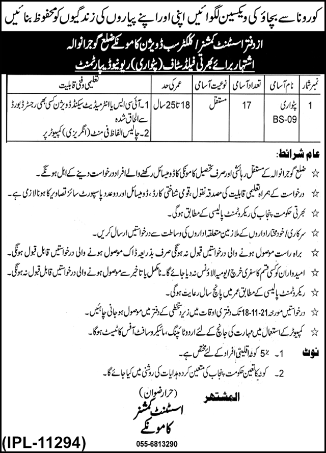 Latest Revenue Department Admin Clerical Posts Gujranwala 2025