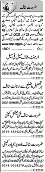 Private Lahore, lahore Punjab Pakistan invites applications from eligible candidates for the post of security guard, clerk, call operator, retired finance manager, retired account manager, retired head master, retired professor, credit officer, retired person, computer operator, retired havaldar, manager, supervisor, driver, retired subedar major, branch accountant, accounts manager, retired doctor, assistant finance, office boy, assistant credit officer, retired lance naik, retired naib subedar, field worker and accountant as per advertisement of November 17, 2023 published in daily Dunya Newspaper. Educational qualifications required Bachelor, Intermediate, Matric, Master and Middle etc.