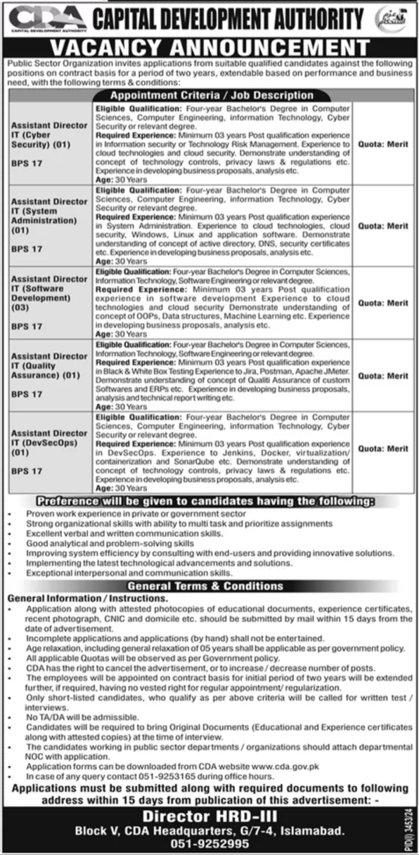 Capital Development Authority CDA Islamabad, islamabad Islamabad Pakistan invites applications from eligible candidates for the post of assistant director software development, assistant director system administration, assistant director devsecops, assistant director cyber security, assistant director quality assurance and assistant director it as per advertisement of November 21, 2024 published in daily Dunya Newspaper. Persons with BCS, Bachelor and BIT etc. education can apply.