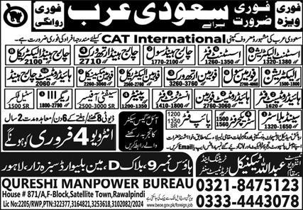 Qureshi Manpower Bureau Riyadh, riyadh Saudi Arabia invites applications from eligible candidates for the post of foreman mechanical, isntrument fitter, foreman electrical, steel fixer, pipe fitter, hydro test fitter, assistant electrician, sand blaster, painter, structure fitter, charge hand electrical, hydrotest charge hand, foreman earth work, electrician, rigger, hydrotest foreman, safety officer, assistant fitter, foreman civil, charge hand earth work and charge hand civil as per advertisement of February 4, 2025 published in daily Express Newspaper. Educational qualifications required Middle, Intermediate, Matric and Bachelor etc.