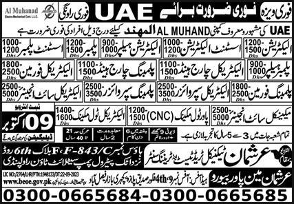 Vacant posts including electrical tool mechanic, plumbing supervisor, plumbing chargehand, engineer, electrical supervisor, power tool mechanic, electrical site engineer, electrician helper, assistant electrician, electrical chargehand, electrician, electrical foreman, plumber, plumber helper, plumbing foreman, mechanical site engineer and assistant plumber are announced in Arshman Technical Trade Test & Training Center Abu Dhabi, sharjah UAE as per 5 October 2023 advertisement in daily Express Newspaper. Educational qualifications required DAE, Bachelor, B.E, Intermediate and Matric etc.