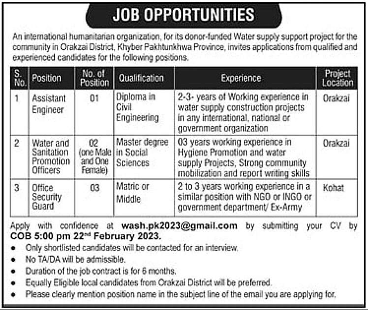Vacant posts including sanitation promotion officer, assistant engineer, water promotion officer and office security guard are announced in International Humanitarian Organization Orakzai, kohat Khyber Pakhtunkhwa KPK Pakistan as per 18 February 2023 advertisement in daily Mashriq Newspaper. Preferred Education is Master, Middle, DAE and Matric etc.