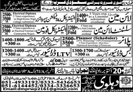 Dahlawi Manpower Recruiting jobs advertisement dated about 18 October 2024 in daily Express Newspaper invites application for the vacant post of electrical foreman, planner, truck driver, heavy boom truck driver, bus driver, ltv driver, driver, scheduler, htv driver, assistant lineman, lineman and electrical protection supervisor in Riyadh, dammam Saudi Arabia. Candidates with Matric, Bachelor, DAE, Intermediate and B.E etc. educational background will be preferred.
