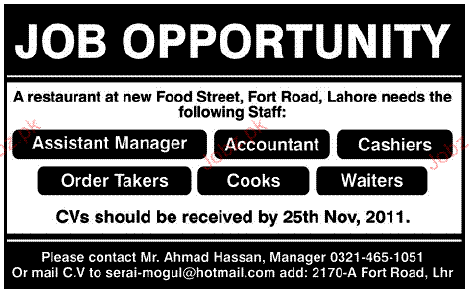 Assistant Manager, Accountant, Cashiers Job Opportunity