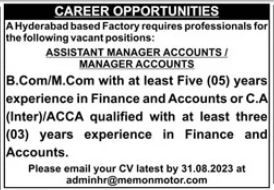 Factory Hyderabad, hyderabad Sindh Pakistan invites applications from eligible candidates for the post of assistant manager accounts and manager accounts as per advertisement of August 13, 2023 published in daily Jang Newspaper. Persons with CA and ACCA etc. education can apply.