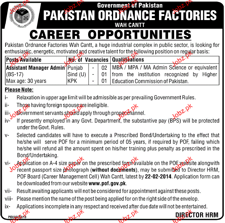 Assistant Manager Admin Job in Pakistan Ordinance Factories