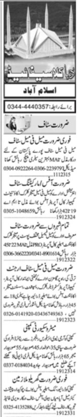 Private jobs advertisement dated about 19 January 2023 in daily Dunya Newspaper invites application for the vacant post of helper, security guard, receptionist, manager, retired subedar major, clerk, retired sepoy, office staff, call operator, retired havaldar, accountant, patient care, retired subedar, driver, office boy, male aya, computer call operator, cook, customer dealer, management staff, assistant manager, chowkidar and male female staff in Islamabad, islamabad Islamabad Pakistan. Middle, Bachelor, Master, Intermediate and Matric etc. educational qualification will be preferred.