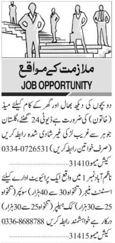 Private Company Karachi, karachi Sindh Pakistan invites applications from eligible candidates for the post of house maid, cook helper, assistant manager and sweeper as per advertisement of June 21, 2024 published in daily Jang Newspaper. Candidates with Primary, Master, Bachelor and Middle etc. educational background will be preferred.