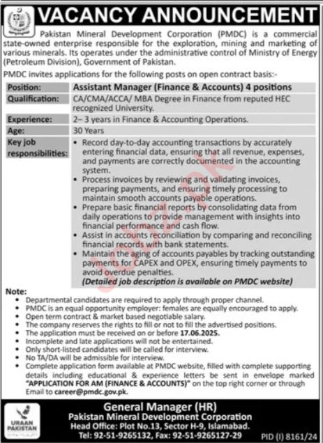 Vacant posts including assistant manager accounts and assistant manager finance are announced in Pakistan Mineral Development Corporation H-9 Islamabad, islamabad Islamabad Pakistan as per 25 May 2025 advertisement in daily Jang Newspaper. Master and Bachelor etc. educational qualification will be preferred.