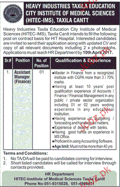 Assistant Manager Finance Job In Heavy Industries Taxila