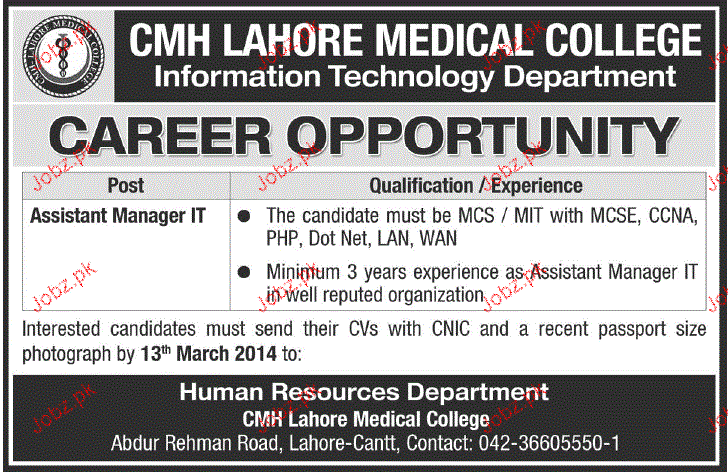 Latest CMH Lahore Medical College IT Posts Lahore 2025