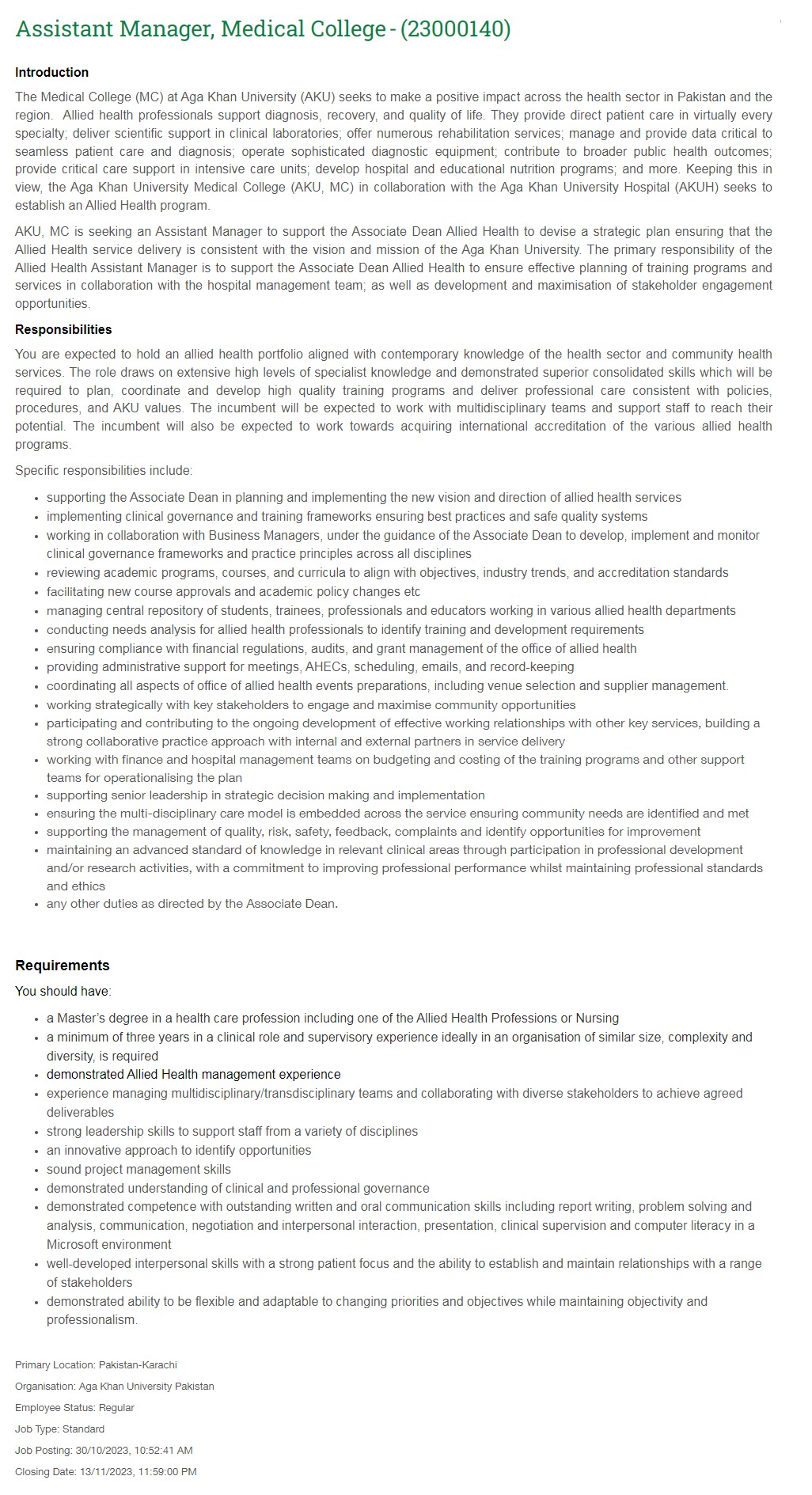 Aga Khan University is looking for candidates for following posts as per job advertisement published in daily Other Newspaper of November 1, 2023 for location Karachi, karachi Sindh Pakistan:
