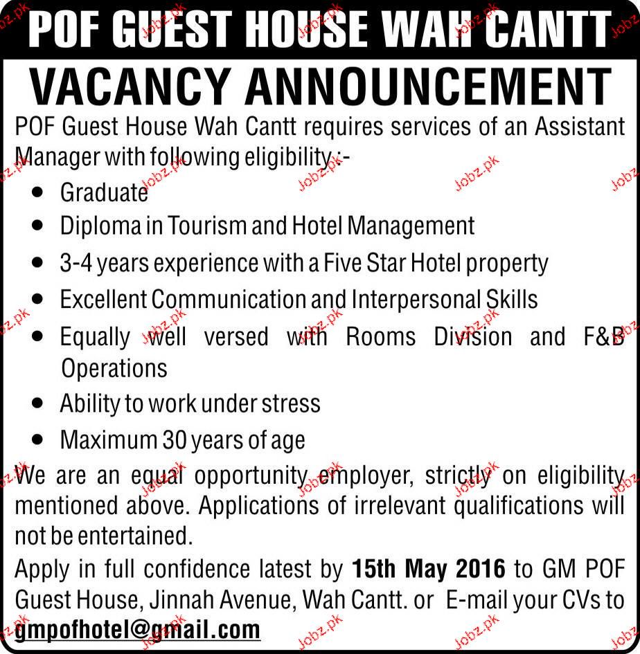Assistant Manager Job In POF Guest House Wah