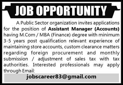 Vacant posts including assistant manager and assistant manager accounts are announced in Public Sector Organization Islamabad, islamabad Islamabad Pakistan as per 27 August 2025 advertisement in daily Express Newspaper. Preferred Education is M.com and MBA etc.