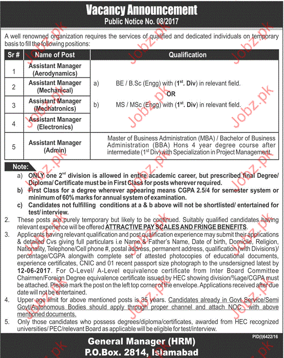 Apply as per details in job advertisement. Login to view further details of how to apply via https://www.jobz.pk online.
