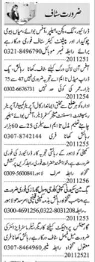 Vacant posts including kitchen helper, master designer, assistant manager, assistant manager customer dealer, fauji guard, husband wife, patient care, cook, office staff, helper, ltv driver, computer operator, tailor, receptionist, driver, civil guard, chowkidar, security guard, call operator and office boy are announced in Private Company Islamabad, lahore Islamabad Pakistan as per 20 November 2025 advertisement in daily Dunya Newspaper. Candidates with Matric, Middle, Bachelor, BA, B.com and Intermediate etc. educational background will be preferred.