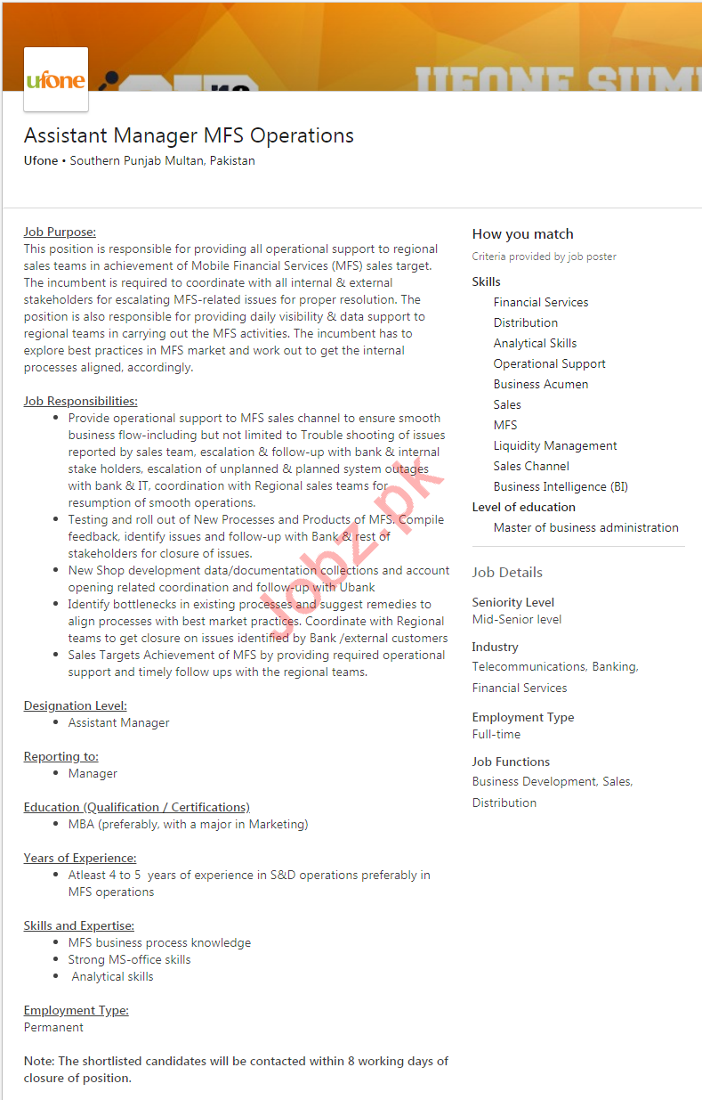 Latest Ufone Mobile Operator Company Management Posts Multan 2025