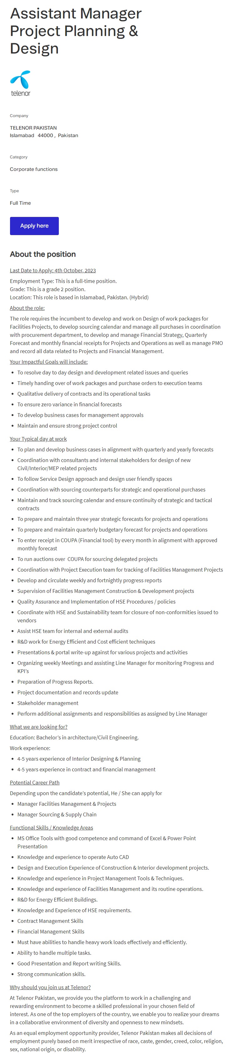 Vacant posts including assistant manager project planning design are announced in Telenor Pakistan Islamabad, islamabad Islamabad Pakistan as per 27 September 2023 advertisement in daily Other Newspaper. Persons with Bachelor and B.E etc. education can apply.