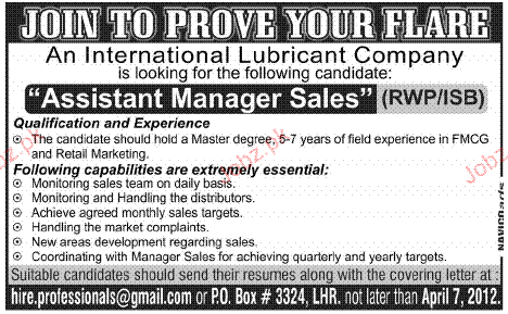 Apply as per details in job advertisement. Login to view further details of how to apply via https://www.jobz.pk online.