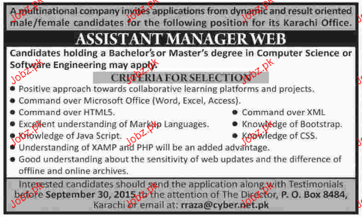 Apply as per details in job advertisement. Login to view further details of how to apply via https://www.jobz.pk online.