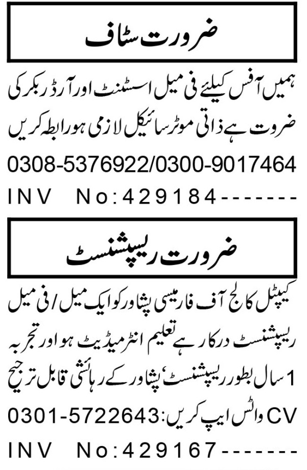 Assistant Order Booker Receptionist Jobs 2024 In Peshawar
