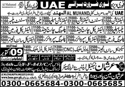Arshman Technical Trade Test & Training Center jobs advertisement dated about 7 October 2023 in daily Express Newspaper invites application for the vacant post of plumbing chargehand, electrical foreman, plumbing supervisor, assistant electrician, power tool mechanic, electrical tool mechanic, plumbing foreman, electrical chargehand, electrician, electrical site engineer, engineer, assistant plumber, plumber, mechanical site engineer, cnc mechanic, electrical supervisor, plumber helper and electrician helper in Abu Dhabi, sharjah UAE. Persons with B.E, Intermediate, Bachelor, Matric and DAE etc. education can apply.