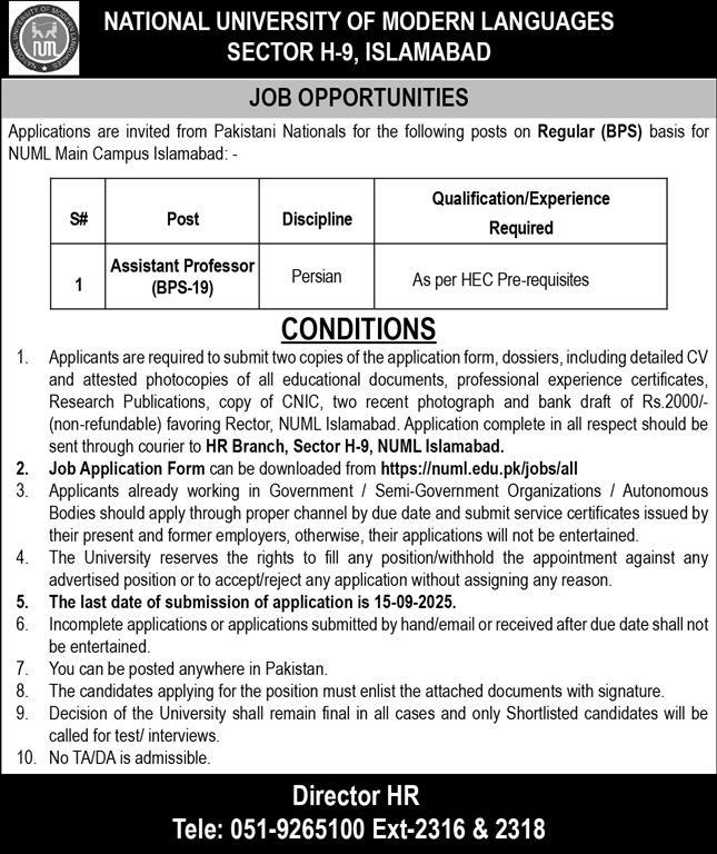 Apply at National University of Modern Languages NUML latest Government jobs in Education and departments before closing date which is around September 15, 2025 or as per closing date in newspaper ad. Read complete ad online to know how to apply on latest National University of Modern Languages NUML job opportunities.