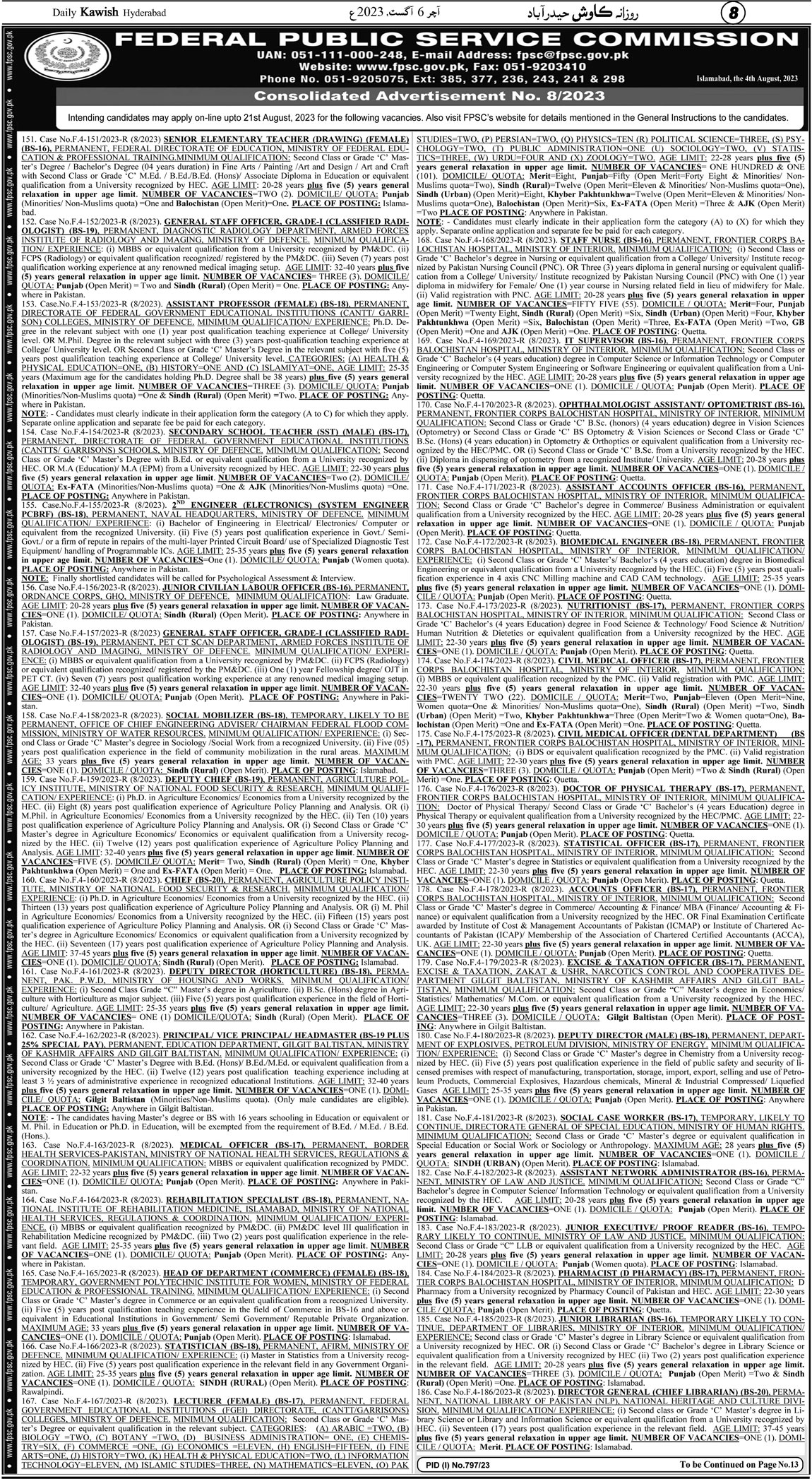 Vacant posts including Male Secondary School Teacher, Ophthalmologist Assistant, Female Lecturer, Statistician, Female Head Of Department Commerce, Proof Reader, Civil Medical Officer, Vice Principal, Social Case Worker, Chief, General Staff Officer, Assistant Network Administrator, Accounts Officer, It Supervisor, Staff Nurse, Executive, Male Deputy Director, Social Mobilizer, Deputy Director Horticulture, Doctor Of Physical Therapy, Engineer Electronics, Biomedical Engineer, Female Elementary Teacher Drawing, Optometrist, Medical Officer, Rehabilitation Specialist, Statistical Officer, Nutritionist, Assistant Accounts Officer, Director General Chief Librarian, Excise Taxation Officer, Deputy Chief, Pharmacist, Civilian Labour Officer, Principal, Librarian, Headmaster and Female Assistant Professor are announced in Federal Public Service Commission FPSC Islamabad, islamabad Islamabad Pakistan as per 7 August 2023 advertisement in daily Kawish Newspaper. Persons with Master, Phd, LLb, Bachelor, B.ed, Mphil, M.com, M.ed, DPT, BDS, BCS, Pharma D, MBBS, MS, BIT and B.E etc. education can apply.