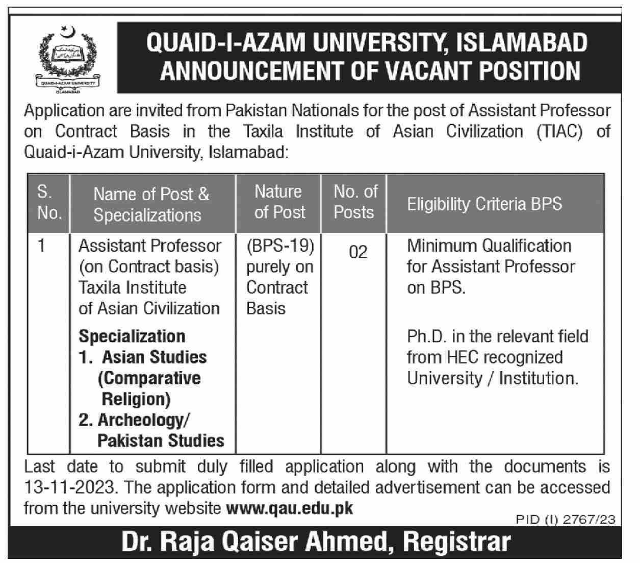 Vacancies in Quaid i Azam University Advertisement November 2023