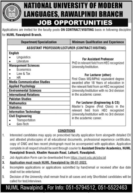 National University of Modern Languages NUML is looking for candidates for following posts as per job advertisement published in daily Jang Newspaper of June 25, 2022 for location Rawalpindi, rawalpindi Punjab Pakistan: