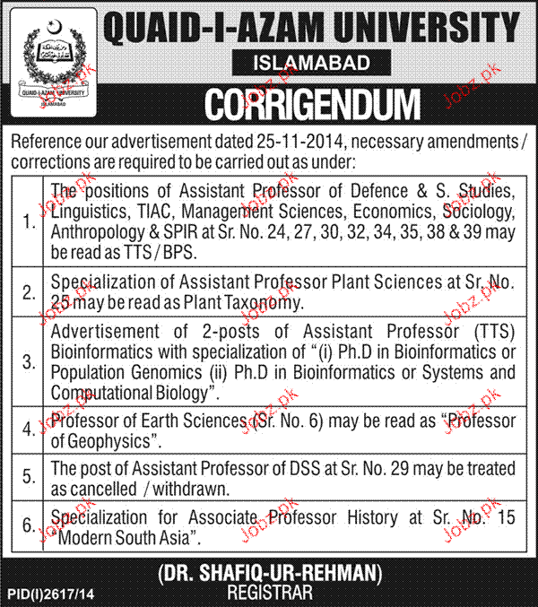 Latest Quaid i Azam University Teaching Posts Islamabad 2025