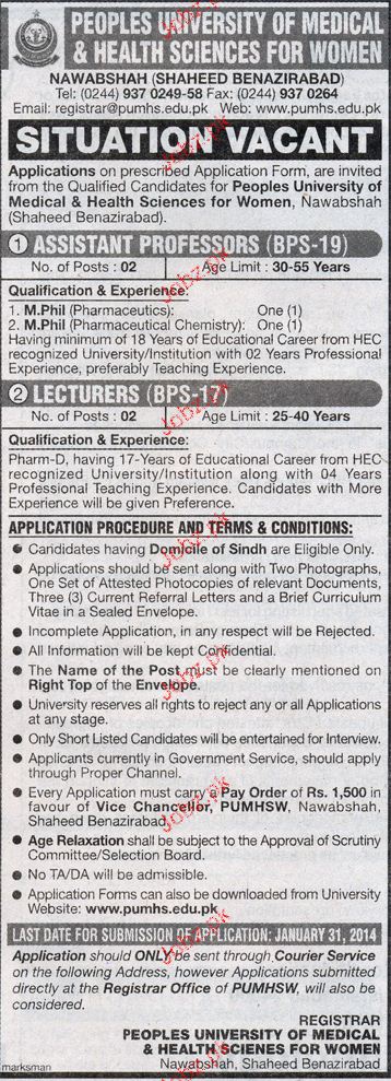 Assistant Professors and Lecturers are required in Peoples University of Medical & Health Sciences For Women in Nawabshah